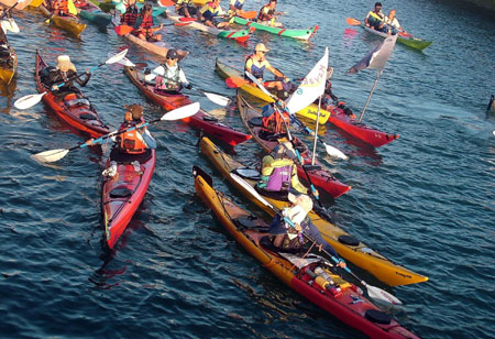 九艘海洋独木舟在上午六时左右集结,并由近二十艘双人艇护航出发至港区外海后,九位好手则航向东行,预计傍晚抵达目的地嘉义东石乡。