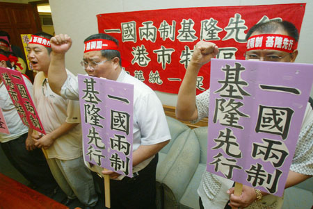 记者会现场悬挂着“一国两制、基隆先行”的标语。工人们表示,希望诉求“一国两制”,可以像香港一样繁荣起来。