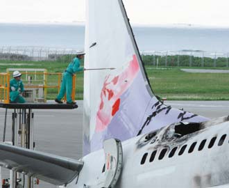 中新网8月22日电 台湾华航昨天在日本国土交通省完成起火飞机现场调查之后,派人用白漆把残骸上的英文名称“CHINA AIRLINES”与尾翼上的梅花标志给涂掉了。