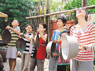 中新网8月29日电 据台湾《联合报》报道,昨晚月全食,台湾嘉义县民雄乡福兴村一群大人、小孩,准时仰望天际观赏,事前还特别模拟古时候敲打锅盆“救月亮”,非常有趣。