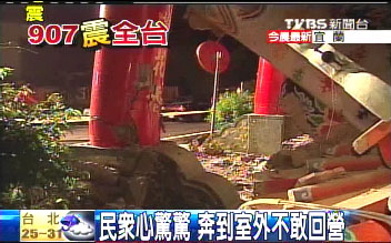 据台湾东森新闻报道,清晨的一阵天摇地动震得台北县板桥四维路一栋民宅的楼顶墙面龟裂掉落,到处可见拳头一样大的磁砖散落在路面,停在公寓旁的家用车车顶也满是碎石。发生在7日清晨1点51分的有感地震,规模高达6.6级,相当于4颗原子弹爆炸威力,震央位在宜兰苏澳东南方74.6公里,深度27公里,属于浅层地震,花莲和平及宜兰牛斗、台东成功震度达到5级,台北也有三级,全台各地都可以感觉明显摇晃。