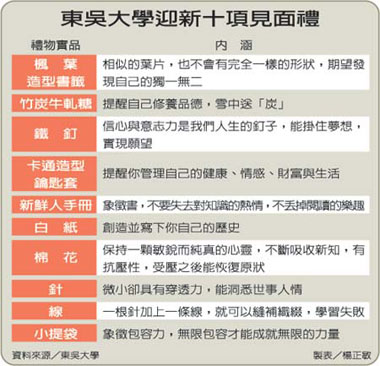 据台湾《联合报》报道,东吴大学11日举行迎新活动,最特别的是赠送十项见面礼,分别是枫叶、炭、铁钉、钥匙、书、纸、棉花、针、线、袋子,各有其象征意义与内涵。