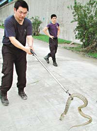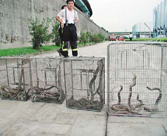 中新网10月8日电 “罗莎”台风远去,台北县板桥市大汉桥下却出现群蛇乱窜的奇景。消防人员抓到137条臭青母、眼镜蛇及水蛇,分析可能是台风溪水暴涨,使得栖息在河边草丛的蛇被大水冲到堤防边。