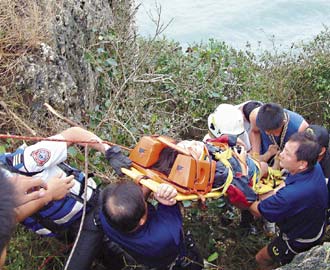 悬崖顶距离海平面约有一百多公尺,崖底全是岩礁。消防局获报连忙动员救人,由消防队员系着绳索,沿着崖边陡峭小道下崖救人;在距离崖顶约十多公尺处,发现她卡在崖壁灌木丛上哀号,花了一个多小时,用担架将她救上崖顶,发现她骨盆骨折,无生命危险。