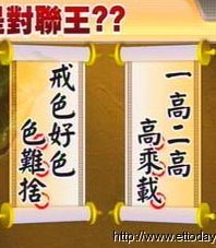 建仔的球迷对出“九胜十胜胜投王”;被英文单字烦死的同学对“一快二快快译通”;受不了蓝绿每天杠的人,对出“返联入联联何国”;当然,最近李安执导的《色,戒》票房大卖,有人也巧思出“戒色好色色难舍”的佳句;不过,要论到“色”,以《色,戒》入联还不够“色”,因为征联中竟然还出现“大奶二奶奶水多”的妙句,当然这个人恐怕真是享尽齐人之福,才能写出这种让主考官看了要昏倒的对联。