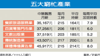 中新网11月5日电 根据1111人力银行调查,扣除兼差等部分工时工作,台湾有五大“穷忙”产业,分别为餐饮旅游娱乐业、百货零售门市业、文教出版业、传统制造业还有媒体广告业。