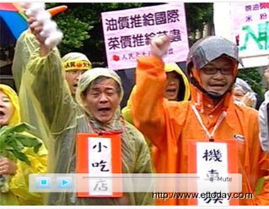 中新网11月6日电 台湾民间团体“人民火大行动联盟”6日着带着蔬果、鸡蛋到当局“行政院”前抗议。行动联盟并列举“高官何不食肉糜 言行录”,其中陈水扁、吕秀莲、“行政院副院长”邱义仁、“行政院经建会”主委何美玥等都榜上有名。