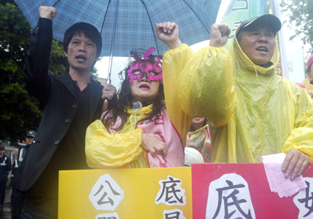 中新网11月27日电 台湾性工作团体“日日春关怀互助协会”今天上午前往台湾当局“行政院”门口陈情,要求兑现陈水扁“大选”时的承诺。知名导演侯孝贤与林靖杰也到场声援。