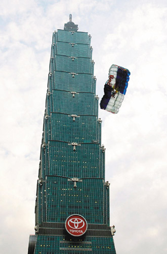 据台湾《中华日报》报道,38岁的奥地利定点跳伞者Felix Baumgartner(中文译为彭刚纳尔)于11日在未经一O一大楼许可情况下,从508米高的台北一O一高楼的一露天观景台纵身跳伞。