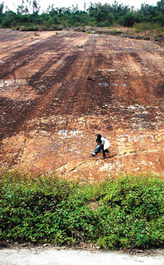 中新网12月18日电 南投县中寮乡“粗坑大峭壁”奇景,地质专家推断年代是古老的第三纪地层,已有三千万年历史,最近成为暴红旅游景点。许多游客竞相攀登峭壁还喷字,留字表示“到此一游”。当地居民看见珍贵的地景遭到破坏相当心疼。