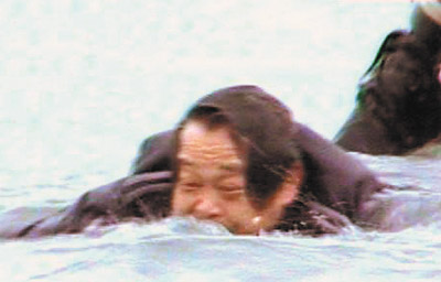 王世坚来不及跳海就被浪打落,载浮载沉。(电视画面翻拍)