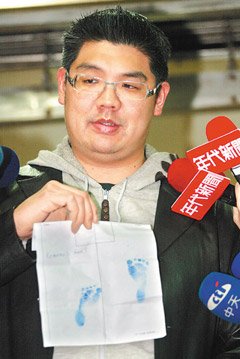 连胜文晚上九点向媒体展示宝贝儿子的脚丫印,他说,看到孩子出世的那一刻,虽然没有掉泪,但还是相当感动,看到孩子的第一眼,觉得孩子长得比较像妈妈,脸型俊秀;体型方面,从脚丫子判断应该是像爸爸,未来应该也会相当魁梧。