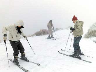 合欢山昨天积雪,吸引爱刺激的年轻人上山体验滑雪。