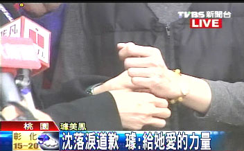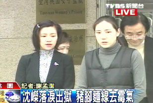 中新网2月26日电 2001因为散布璩美凤光盘入监服刑1年的沈嵘今天出狱,璩美凤和沈野夫妇及40名独家报道的员工,前往桃园女子监狱接沈嵘出狱,沈嵘落泪向璩美凤鞠躬致歉,璩美凤则赠送佛珠,希望给她力量。