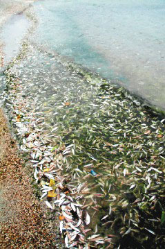 澎湖马公市青湾海岸漂来大批鱼尸,珊瑚礁鱼类受创尤其严重。 联合报图