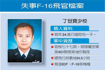中新网3月5日电 据台湾《联合报》报道,台湾空军少校飞行员丁世宝昨晚驾驶F-16战机在花莲外海失联。台空军初步分析,很可能已经坠机。