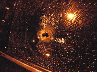 死者萧名享的后车窗留下弹孔。(图:台湾《联合报》)