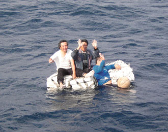船长徐东诚(右)与两船员坐在浮垫上,在海上漂流十一小时获救。