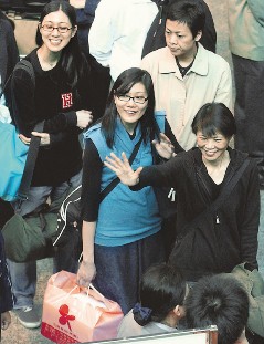 排队等候时间,两位女儿马唯中与马元中多半维持酷酷的模样,从头到尾拎着自己的行李与礼品,不假他人之手。周美青与两位女儿短暂相处三十五个小时,排队时三人偶尔也窃窃私语。