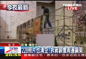 2日晚,台北“中正纪念堂”蒋介石铜像周边的钢架被拆除。(图:台湾TVBS)