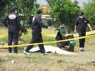 据台湾联合报报道,高雄警方昨天接到报案,指在鸟松乡美庄路见一名妇人躺在路旁芒果园地上,满头鲜血,身旁停放一辆机车(摩托车)。