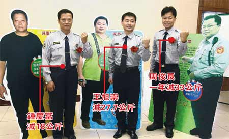 专业警察单位第1名的铁路警察局警员钟庆富利用饮食控制跟慢跑快走,3个月内成功减下18公斤。女警方面,花莲县警察局督察室督察员连锦秀05年产后胖了30公斤,利用中午游泳及骑自行车,成功减下30公斤,都是减重成功的最佳范例。