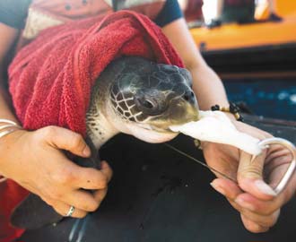 绿色和平组织成员从船上救下榄蠵龟,并就地放生。