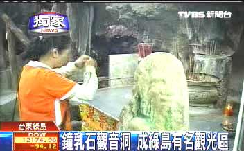 中新网6月18日电 据台湾TVBS报道,绿岛有个钟乳石洞,里面有一座石笋,样貌很像一座观音,当地民众称为“观音洞”,相传多年前,有一名妇人来这里拜拜求子,果然成功,故事不断流传,后来越来越多人相信,有从台中、高雄来,还有从基隆来,他们数十个人包船或搭机来,现在观音洞,已经成了绿岛知名的观光地区。
