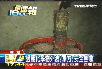 化学品上头写着DS2-消除剂,生产日期是1989年3月,有效期限只能到1992年3月,全是台军联勤204厂所制造。制造方表示说:这些被弃过期化学品“对人体没有影响,消除剂里头有强碱,对环境会有疑虑,我们会专人回收处理。”