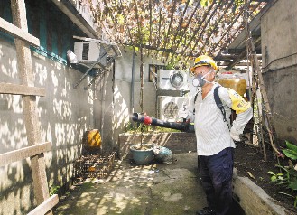 (图片来源:台湾《联合报》)台北市出现本土登革热疫情,工作人员正在喷药,消灭病媒蚊。