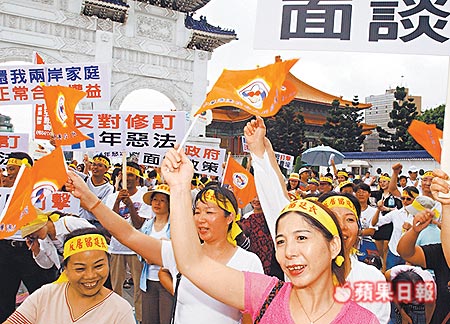 资料图:2007年是两岸通婚二十周年,有超过二十五万名大陆配偶在台湾生活。但由于当局的限制性政策,大陆配偶在岛内的权利难以得到保障。07年12月21日,“中华两岸婚姻协调促进会”在“移民署”门前集会,申要人权与平等待遇。 中新社发 陈国华 摄