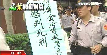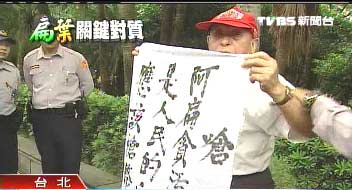 据台湾TVBS报道,顾不得被大批警力包围,有话要说的老伯伯努力甩开束缚,挣扎中,趁机秀出抗议陈水扁的海报。抗议老伯伯:“你看看应该判死刑!对不对!”