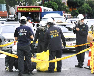 据台湾《联合报》报道,14日中午十一点十六分,台北市消防局和环保署接获通报,指中华路、广州街口有不明粉末飘散,气味刺激,骑摩托车的行人难受地将车子停靠在路边喘息。消防队除派救护车载运伤员,也出动化学灾害处理车到场应变。