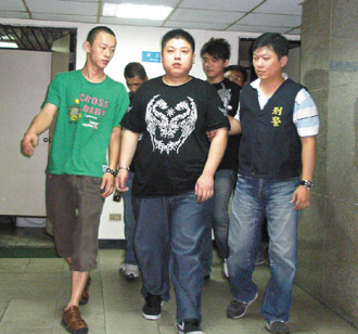 台北市警方逮捕涉嫌掳人凌虐强索遮羞费的恶煞,其中嫌犯林枫杰(中)还逼被害人吞下两颗子弹,手段凶残。 (图片来源:台湾《联合报》)