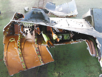 空军编号一六一五IDF双座战机,前天上午飞到澎湖草屿石礁靶场炸射时失联,两名飞行员失踪。军方昨天捞获疑似IDF左、右襟副翼及零组件、高压气瓶、机炮自动马达及发动机下方挂点等残骸,不是断裂就是严重扭曲,未见爆炸痕迹,军方分析“战机撞击海面造成”。