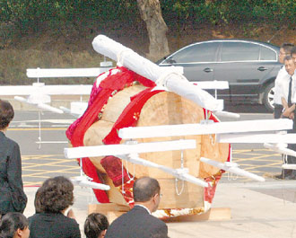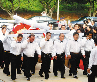 跪迎仪式简单隆重,随后灵棺就由24位壮汉抬入灵堂。据了解,王永庆的“入殓”仪式,预定在下午5时举行。