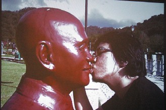 中新网10月27日电 台湾交通大学一男子,到一处收集蒋介石铜像最多的公园,狂吻蒋介石铜像“足足6分钟”,该男子还把这段过程拍成影片,在学校艺文空间展出,备受瞩目。
