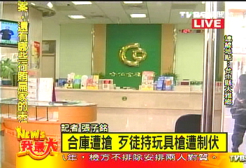 中新网10月29日电 台湾台中县一处金库,今天下午发生抢案。歹徒戴着墨镜和安全帽,持玩具枪进入行抢,却遭保安识破而当场制止。警方目前已经抓到这名嫌犯。