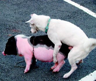 狗和猪是不同的物种,也能交配吗?兽医说,也许土狗在麝香猪的身上闻到类似母狗散发的费洛蒙,才会一时“性”起,也可能只是动物间的一种“社会行为”,并不是为了交配。