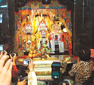 中新网2月5日电 据台湾《联合报》报道,嘉义新港妈拜访云林北港妈的会香活动,4日达到最高潮,两尊妈祖正式和解,现场人声鼎沸,附近街巷挤得水泄不通,见证六十年首见的“妈祖和谈”。