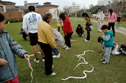 中新网2月8日电 据台湾《中国时报》报道,到公园遛狗、遛鸟、遛迷你猪之外,新竹县一公园草地上,7日出现7条白蛇集体出游,引起不少散步民众惊声尖叫,“哇,怎么会有这么多蛇啊,好可怕!”也有人觉得十分新奇有趣,原来是一名爱蛇成痴的男子在遛蛇。