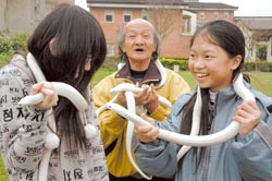 13岁的初中女生小玲,大胆地把白蛇放在脖子,还耀武扬威对妈妈说:“你看,我很勇敢吧!”8岁的小二生小武抓着蛇头到处吓人。17岁高中生小芳,把白蛇当围巾套在脖子取暖。