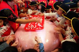 小朋友们边搓汤圆,边念吉祥话,要大家一起“搓圆圆、赚大钱”“团团圆圆大吉大利”。