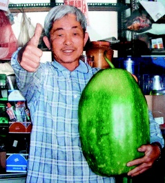 元宵节那天摘下瓜,竟是一颗巨无霸,“大家都吓了一跳”,秤一秤,重二十多台斤,高约两台尺、径围近一台尺,念小学的孙子搬不动,只能放在水泥柱上留影,邻居齐聚围观。