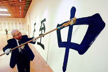 88岁的杨家麟原本想重现当年用木棍、铁丝绑麻绳书写大中至正的情景,但他昨天因关节炎旧疾发作、无力握笔,只好展出事先写好的大字,象征性地比划比划让记者拍照。
