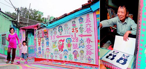 中新网4月7日电 据台湾《联合报》报道,台中市有处五彩缤纷的彩绘眷村,墙面、地板画满人像、动物与色块,梦境般场景吸引大批博客、摄影玩家,孤寂的眷村顿时热闹起来;这些图画都出自86岁退伍老兵黄永阜之手,他说,画图是排遣无聊,没想到大家喜欢,让他越画越起劲。