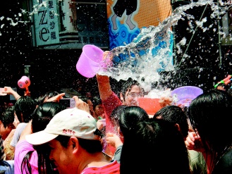 中新网4月13日电 台湾台北县“中和市2009泼水节”昨天上午在南势角捷运站盛大登场,民众拿着水枪、水瓢、水桶到处喷洒开战,台北县消防局也调派两辆消防水车加入战局,超强水柱扫射现场民众,让民众遇水则发,气氛夯到最高点,乐到不行。