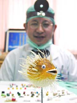 张文源指出,“身为一名耳鼻喉科医师,你永远不知道,到底能从病人耳鼻喉中夹出甚么东西来?”在他搜集琳琅满目的异物中,最常见的就是鱼刺。张文源最近心血来潮,花了两天时间,把近四百根鱼刺造成一只鼓胀的河豚,藉以提醒民众,吃鱼的时候要小心。