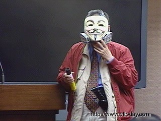 都说是狂人,要耍当然就耍些破格的把戏。这星期二,大师不知哪来的灵感,化身为正义凛然的“V怪客”,在“立院”内狂喷瓦斯力阻军购案。