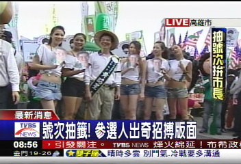 据“中央社”以及东森新闻报道,“假面特攻队”比出招牌的姿势,从太空来帮谢长廷加油打气!在抽签时候造势光靠旗子那就逊掉了,抢镜头没人比的上现场的这两位──比基尼辣妹,泳装加超短裙,感觉像是在走秀;还有参选人办成超人,连女儿也得戴上眼罩和老爸一起打选战。不过大家都在拼政治,两位绿党参选人为要“拼环保”,甚至一个打扮成大树,一个变成黑面琵鹭。